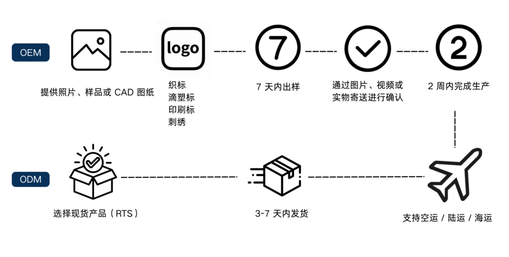 定制服务 只需三步,即可实现您的定制需求。 向我们提出您的想法,看我们如何助您将概念转化为现实产品。 第一步:咨询与设计我们的设计师将为您提供专业支持。您可以从我们的现货产品中挑选,也可以要求进行全新设计。 第二步:样品制作我们仅需 3 到 5 天即可为您完成样品制作。在样板开发过程中,您提出的每一个细节都将被视为关键。 第三步:高品质生产样品确认后,我们将开始批量生产。起订量(MOQ)为 500 件。您通常可以在 5 到 7 周内收到成品。 如何订购 享受便捷简单的下单流程 Speed up all processes! 我们提供专业且免费的咨询服务 立即联系我们